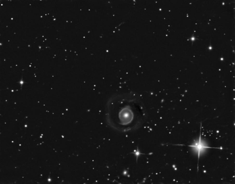 Objekt / Name: UGC 6614 (Ring Galaxie )Sternbild: Löwe (Leo)Koordinaten (J2000): 11.39.15 + 17.08.43Teleskop: 303/1200 mm NewtonKamera / Filter: Orion G 3 Aufnahmedatum: 04.04.2016Belichtungszeit: 20 x 120 Sek.Kommentar: Eine “GLSBG” (siehe Text --->Weblink dazu: HIER
